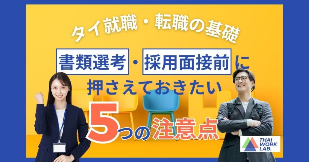 - タイ就職・転職の基礎|書類選考や採用面接前に押さえておきたい5つのポイントタイ就職・転職で避けては通れない「書類選考」と「採用面接」この記事では選考時に押さえておきたい5つのポイントを解説しています。履歴書作成時の注意点や面接で絶対聞かれる質問なども交えてお話ししてみました。