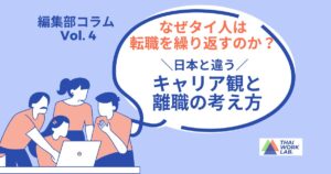 - なぜタイ人は転職を繰り返すのか?日本と違うキャリア観と離職の考え方タイ人が転職する理由とは?日本とタイの転職やキャリアに関する考え方を比較解説しています。離職率が低い会社の特徴も公開しています。タイ人部下の離職に悩む管理者必見の内容です。