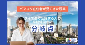 - バンコク在住者が見てきた現実|タイで長く活躍する日本人と早期帰国者の分岐点タイで長く活躍する日本人と早期帰国者には、明確な差があります。駐在員・現地採用・起業者それぞれのリアルを整理しながら、成功者に共通する4つの習慣と、多くの人がハマる落とし穴を在住者の視点で徹底解説します。